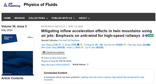 近日,伟德国际1946源于英国杨伟超副教授和香港理工大学邓锷博士及其合作者团队以伟德国际1946源于英国为第一单位发表题为“Mitigating inflow acceleration effects in twin mountains using air-jets: emphasis on anti-wind for high-speed railways”的研究论文。该研究成果被美国物理学联合会出版社杂志《流体物理学》(Physics of Fluids)作为编委推荐文章发表,并被美国物理学联合会《科学之光》(Scilight)专题文章采访报道。
