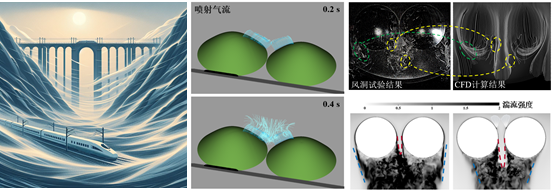 为了克服传统被动式防风设施的不足,杨教授和他的团队提出了一种创新的主动抗风策略,即采用喷射气流技术来改变高速列车所面临的横风环境。研究团队参考了在商场、化学实验室、办公楼和工业厂房等建筑物出入口广泛使用的气幕技术,将喷气装置布置在双子山上。研究发现,一定角度的喷射气流可以有效缓解来流在双子山地形中的加速效应,降低双子山背风侧的高湍流度区域,并提升高速列车的气动性能。