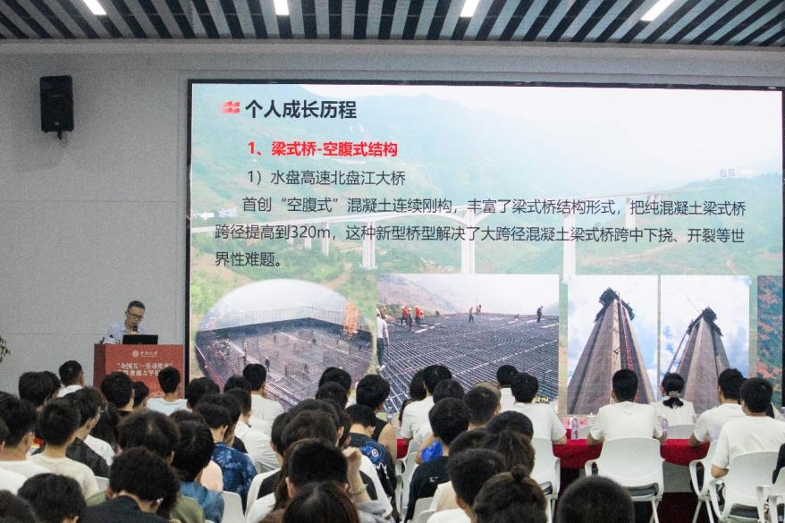 “青年要提升工匠五力——引领力、传承力、实践力、创新力、攻关力”。报告会上,郭吉平先生谈到了工匠精神的时代需求,他强调“目前社会基础技能人才供应还无法满足需求,基础技能人才短缺问题成为了制约社会经济发展的一个重要因素”,并鼓励青年学生提升工匠五力。“创新思维必须勇于走进‘禁区’,敢于跨越‘雷池’,打破条条框框的束缚,打破惯性思维的枷锁,才能创造出属于自己的东西。”天道酬勤,力耕不欺,参与建造桥梁56座,其中世界前100座高桥8座,他与同事们基于解决桥梁建造中面临的难题获授专利168项。他以恒心与毅力助力技术难题解决,生动地展现出“执着专注、精益求精、一丝不苟、追求卓越”的工匠精神。