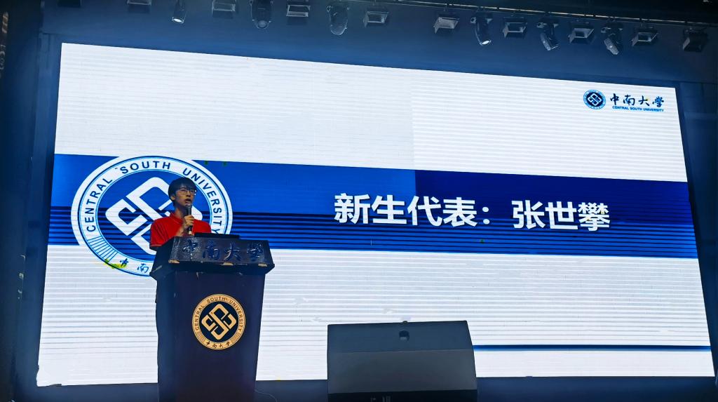 2024级硕士研究生新生代表张世攀代表全体新生向师长及亲友们表示了诚挚的敬意与感谢。“回顾过去,无数日夜的磨砺与奋斗见证了我们从青涩到成熟的蜕变;展望未来,面对科研之路上的未知挑战,我们满怀憧憬与期待,拥抱新知,探寻梦想,不断超越。”秉承“知行合一,经世致用”的校训,继承“备物致用”的为学之道与“为万世开太平”的宏大志向,与中南同行,与先辈同行,与时代同行,努力成长为堪当民族复兴大任“中南人”。