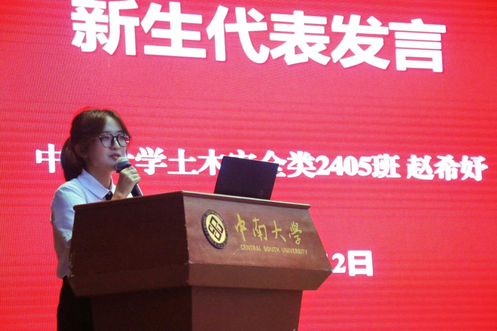 9月12日19:00主持人宣布会议开始,全体参会人员起立、奏唱国歌。在新生代表发言环节,土木安全类2405班赵希妤代表全体新生发言:“在未来的日子里,相信我们将亲眼见证一座座高楼拔地而起,一条条道路纵横交错。那便是我们们用双手绘制的蓝图,更是我们逐梦路上的丰碑”!