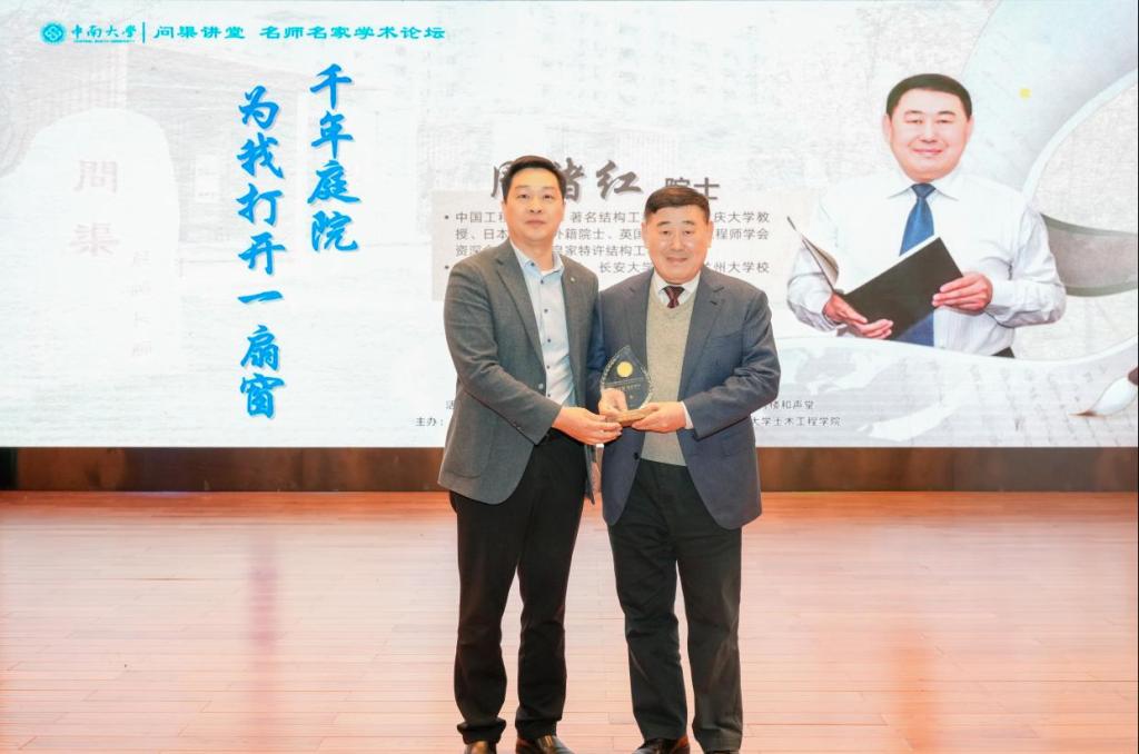 互动交流环节,周院士还悉心解答了同学们关于土木行业未来发展趋势、青年科研人员职业规划等一系列问题,展开了深入讨论交流。现场掌声雷动,同学们反响强烈,互动交流环节结束后,学生代表向周院士献上鲜花表示感谢,何旭辉副校长为周绪红院士递赠名师名家论坛嘉宾纪念牌。
