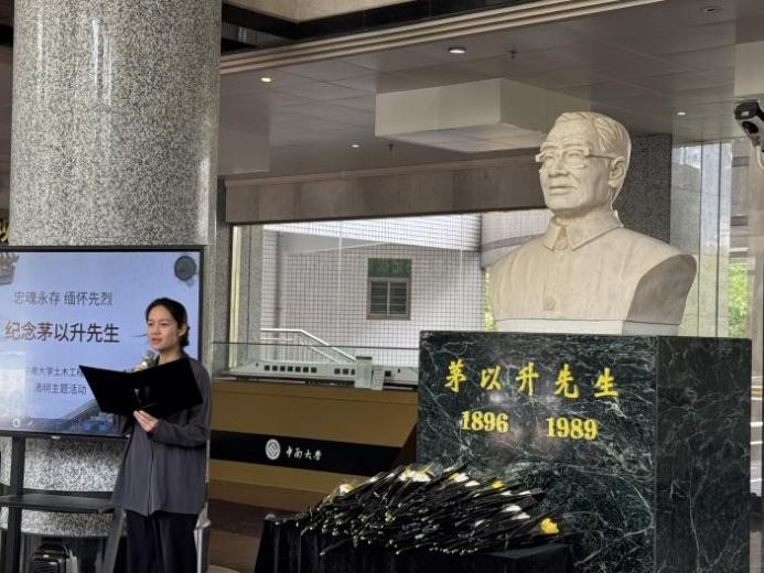 活动伊始,主持人介绍了茅以升先生的生平事迹与卓越贡献。茅以升先生是中国现代桥梁工程的奠基人之一,他主持设计并建造了中国第一座现代化大型桥梁——钱塘江大桥,并在抗战时期以民族大义为重,亲手炸毁大桥以阻敌,战后又主持修复,展现了科学家与爱国者的崇高精神。随后,学生代表擦拭茅以升先生雕塑以表达对先辈的敬仰之情。全体成员肃立默哀一分钟,追思先生为国为民的赤子之心。默哀结束后,师生依次上前,向雕塑敬献菊花,寄托哀思。