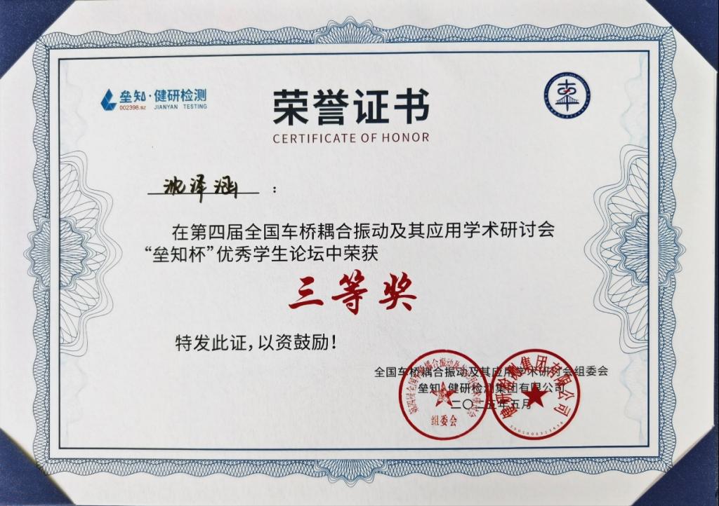 17日下午,陈宜玲作了题为《列车-有砟轨道-路基耦合系统多尺度精细化建模及动力响应分析》的分会场专题报告。沈泽涵参加了优秀学生论坛并作了《基于MBD-DEM-FDM耦合的列车-有砟轨道-路基系统宏细观动力响应研究》的报告,与来自大连理工大学、重庆大学、同济大学、北京交通大学等博硕士生选手们一起同台竞技,最终获得三等奖。