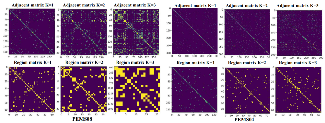 研究团队创新性地提出了区域图神经网络(RGNN)框架,该框架通过引入区域图表示(RGR)与细粒度重构(FGR)技术,将复杂物理系统中的关键部件作为节点,耦合关系作为连接,赋予节点和边物理属性,实现了对系统动态特性的精准捕捉。通过灵活调节“区域阶数”,有效控制了图结构规模,在保留核心拓扑信息的同时,将节点数量大幅压缩至原规模的10%-50%,显著提升了计算效率。同时,借助线性变换矩阵实现区域特征向量的重新分配,确保了信息的精准传递与无损重构。此外,研究还集成了稀疏时间感知专家模块,该模块能够动态融合短期波动与长期趋势的多尺度信息,有效解决了传统模型在信息融合上的局限性,提高了长期预测的准确性和稳定性。同时,提出的融合图卷积(FGC)技术,优化了大型图结构中远距离节点的信息交换机制,实现了高效的信息传递,避免了传统方法中的效率牺牲与信息丢失问题。实验结果显示,该技术在PEMS08数据集上的计算速度提升了45.7倍,内存消耗降低了87%。在PEMS04和PEMS08两个经典数据集上的验证表明,区域化后的邻接矩阵与原始邻接矩阵在核心拓扑特征上高度一致,有效保留了局部连接特性和整体疏密分布规律。