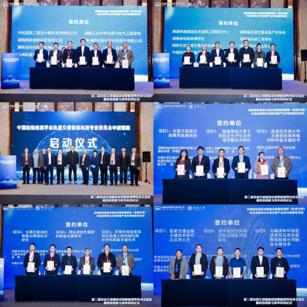 同期举办了高端智检装备与基础设施智能建养科技成果转化对接会暨产业共同体建设活动,举行多项科技成果转化合作签约、湖南省轨道交通高端智检装备产业共同体签约、中国检验检测学会轨道交通智能检测专业委员会筹建启动等仪式,推动产学研用深度融合,加速技术成果落地转化。