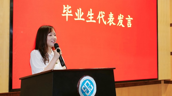 毕业生代表工程管理系硕士研究生罗吴赞发表了毕业感言。她从结合研究生的学习历程从感谢自己、感谢导师、感谢学院三个层次表达了对过去的回忆与对未来的展望,并鼓励大家成为能够坚持追逐理想的人、敢于创新实践的人、勇于奉献前行的人。
