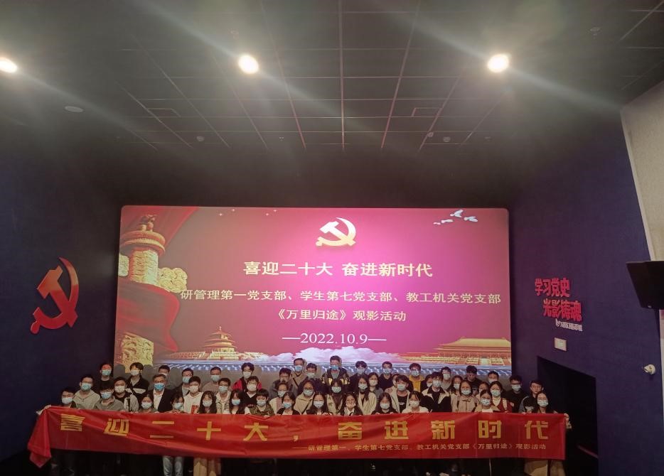 为庆祝新中国成立73周年,迎接党的二十大胜利召开,进一步弘扬爱国主义光荣传统、提升支部党员爱国主义信念,2022年10月9日晚,教工机关党支部、研管理第一党支部、学生第七党支部联合举办以“喜迎二十大,奋进新时代”为主题的党日活动,共74名党员集体观看爱国主义教育影片《万里归途》,伟德国际1946源于英国党委书记蒋琦玮参与此次活动。