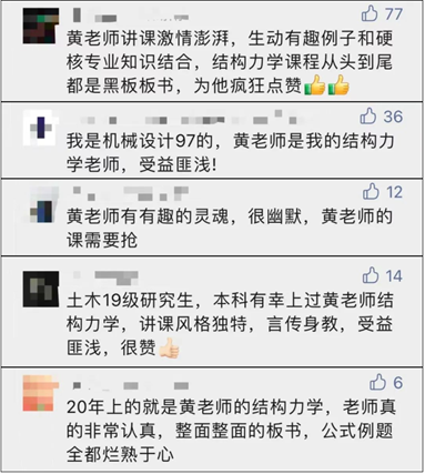有学生表示“黄老师上课从不带教材,不用PPT全部采用板书授课比如弹性力学他能记住课本中的所有公式每次上课都能一步一步推导”。力学理论抽象、公式繁杂,是一门让不少学生头疼的大学科,黄方林自信地说,“所有的公式和例题都在我的脑子里,用PPT上课会不自觉往PPT上靠,而公式只有通过一步步抽丝剥茧般的推导才能让学生了解其中的奥妙”。疫情期间,黄方林面对着空无一人的教室开展线上教学,他依旧坚持手写板书,为本科生录完了整学期的结构力学课程。每到期末他总会及时组织学生答疑活动,他认为会问、敢问是让学生能够受益一生的能力。