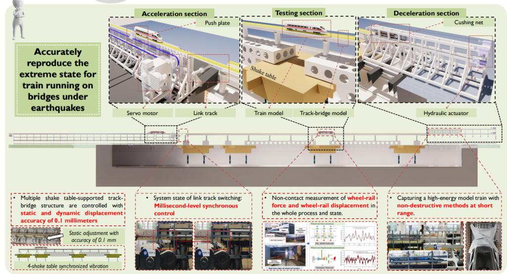 发明简介:我国高铁路网多穿越地震区,保障地震下桥上行车安全是高速铁路建设和可持续发展的重大需求。因地震突发性、破坏性和不可预见性,世界范围内高铁震害记录缺乏,没有震致列车脱轨室内试验方法和科学试验实证。本发明的地震下高速铁路桥上行车安全试验技术及系统,是国际首创复现地震下桥上行车性能和列车脱轨极端状态的试验装备,完成了500余次地震下桥上行车试验,为揭示灾变机理、提出控制指标、研发减隔震产品以及修订国家与行业标准提供了关键试验平台。该专利技术已实施,所研制的大型科学仪器总投资6000余万,获得2022年度中国专利优秀奖,所研发和验证成果支撑了国家技术发明二等奖、湖南省科技进步一等奖等重要奖励。