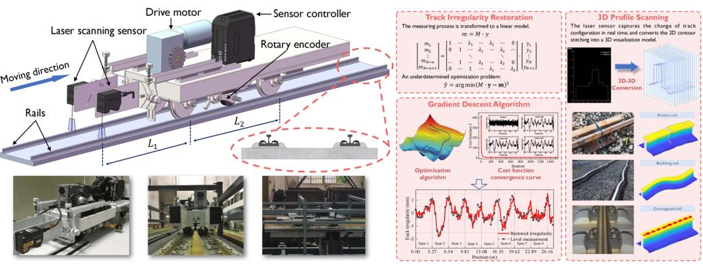 发明简介:轨道不平顺是影响高速列车行车性能的关键基础数据。针对所研制的地震下桥上行车试验系统的1/10缩尺比例模型,研发了可实现三维轮廓智能扫描技术,可通过扫描小车的轴距调整与梯度下降技术实现轨道不平顺0.01mm级别、三维尺度的试验精准测量。该专利已实施,为地震下桥上行车性能试验测试提供了关键基础数据,支撑了教育部科技进步一等奖等重要奖励。