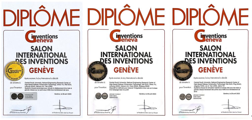 2023年4月26日–4月30日,第48届日内瓦国际发明展(International Exhibition of Inventions of Geneva)在瑞士日内瓦举行。伟德官网3项专利技术参加此次国际发明展,获得了1项金奖和2项银奖的优秀成绩。其中,“地震下高速铁路桥上行车安全试验系统”获得日内瓦国际发明展金奖;“一种基于激光轮廓扫描的轨道不平顺测量装置与方法”、“地震作用下高速铁路列车走行实时模拟试验系统”获得银奖。