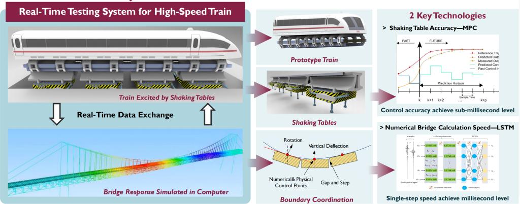 发明简介:如何实现地震下高速铁路列车走行安全的室内足尺试验研究、如何实现400公里时速轮轨及时速600公里级高速磁浮的室内足尺试验测试,是该发明专利所解决的核心难题。该专利通过“数值”线路与“试验”列车的数物融合混合试验技术,创新发明了地震极端灾变和更高行车速度测试的室内足尺试验技术,解决了轨道-桥梁大型数值模型毫秒级实时计算、六自由度度八台阵液压伺服系统毫秒级时滞控制、轮-轨与磁-轨数物边界高精度协调等关键技术难题。该发明专利已成功实施,依托中车青岛四方机车车辆股份有限公司实施,设备总投资1.6亿,研制了国际唯一的我国时速600公里级高速磁浮桥上行车性能测试平台。