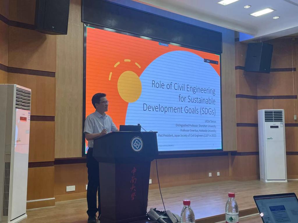 在第一场报告中,UEDA教授首先介绍了当前国际可持续发展的17个目标,其主要体现在三个方面——社会、环境和经济可持续,而土木工程领域尤其是基础设施建设对于目标的实现有着举足轻重的影响。接着UEDA教授着重介绍了碳中和及其实现蓝图,在土木工程领域对建设过程轻排放、绿色材料开发、结构全寿命周期运维及基础设施建设战略安排提出了更高的要求。最后UEDA教授介绍了在土木工程领域关于可持续发展规范化、标准化的重要性和急迫性,并强调了在这方面关于进一步加强国际合作特别是中日合作的必要。