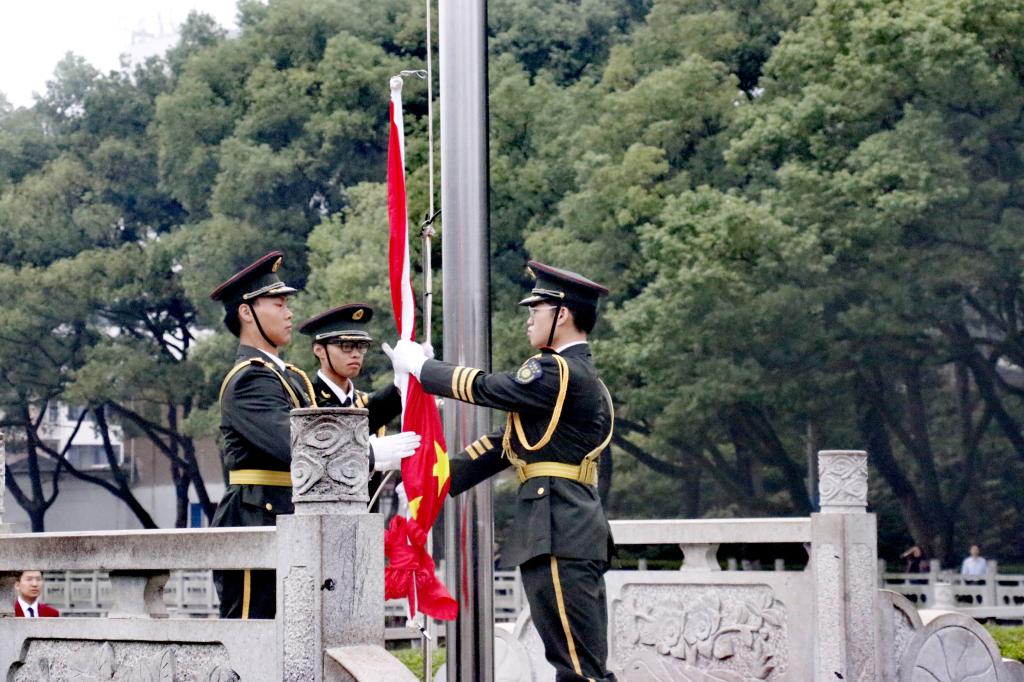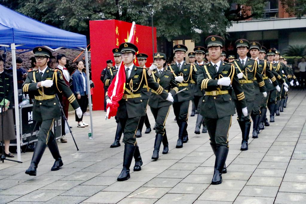 秋风送爽,旭日初升,清晨7:00,升旗仪式正式开始。国旗班仪仗队员身着挺阔军装,戴穗执枪,迈着整齐有力的正步行至旗杆前。随着《义勇军进行曲》庄严奏响,擎旗手振臂将旗帜高高抛出,鲜艳的五星红旗在熹微晨光中冉冉升起,全体师生行注目礼,齐唱国歌。伟德国际1946源于英国全体同学统一穿上文化衫,以饱满的精神面貌与澎拜的爱国热情为祖国送上衷心祝福,以“知行合一,经世致用”的校训为学校发展做出自己的贡献。两鬓斑白的老党员眼眶中饱含着骄傲的泪水,脸庞青涩的新同学扬起了自信飞扬的微笑,观此胜景,壮怀激荡,每一位师生都在此刻抒发着对祖国富强、民族进步的美好愿景。