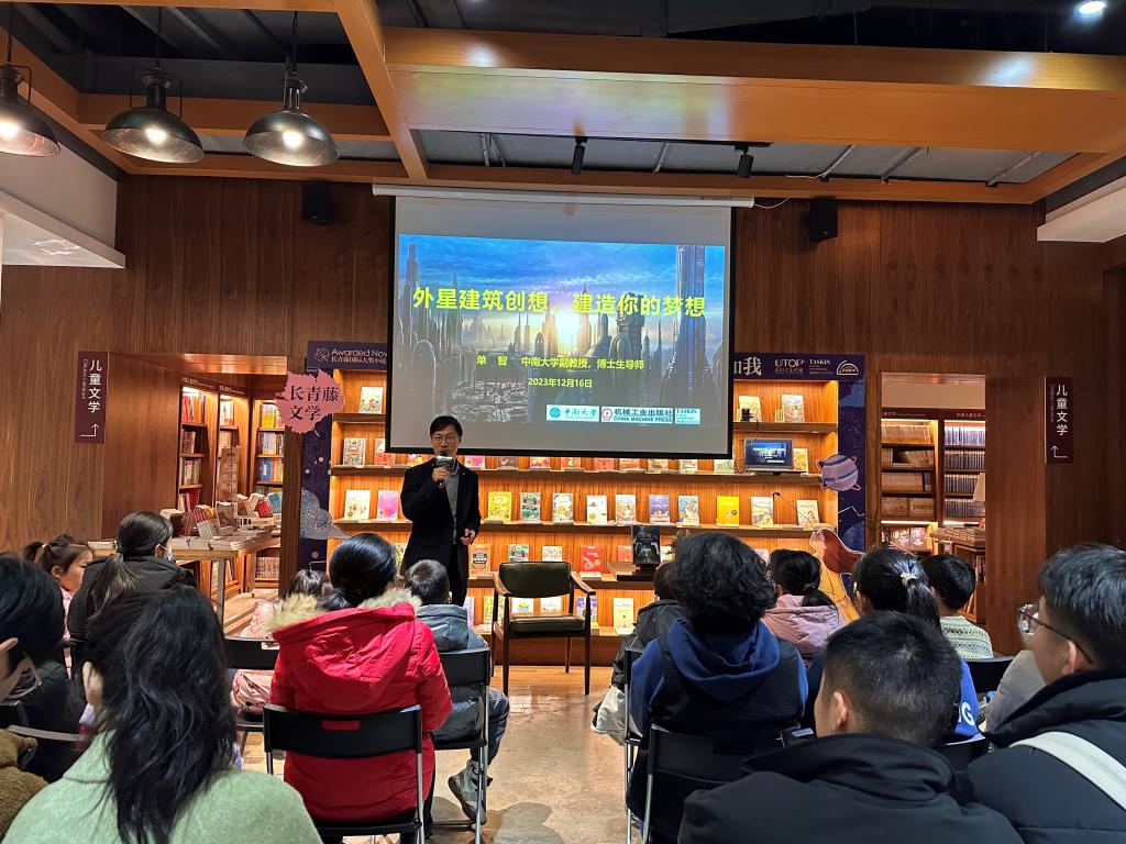 自2022年至2024年初,单老师与李老师在伟德国际1946源于英国第二附属小学、湖南图书城和德思勤24小时书店等,围绕《科幻电影中的建筑》《太空建筑创想,建造你的梦想》《机器人和房子》等主题开展了多场科普讲座。在讲座中,两位老师生动形象地讲解了建筑艺术和建筑技术知识,探讨了未来人类在地下、外星、太空甚至虚拟世界等各种环境中的建筑审美、技术挑战以及可能解决方案,并采用多种互动形式让观众体验3D打印等新兴建造技术。该系列讲座主要受众为青少年,累计200人次参与。