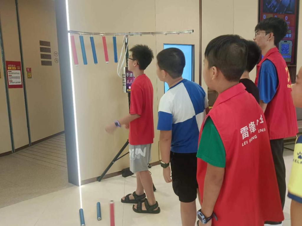 在“穿越火线”游戏中小朋友们勇于挑战,不断尝试,力争拿着手中的探测器绕着金属杆走得更远;“眼疾手快”游戏也在如火如荼地进行着,考验着小朋友们的反应能力,很大的激发了他们的兴趣。