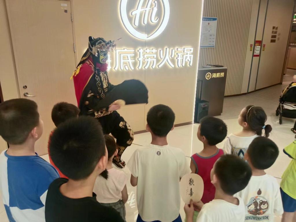 与此同时,海底捞工作人员进行变脸表演,不同的表情背后传递着人物的思想感情和内心变化,激发了小朋友们的好奇心,同时也是将变脸文化传承,让它在小朋友们的心中生根发芽。
