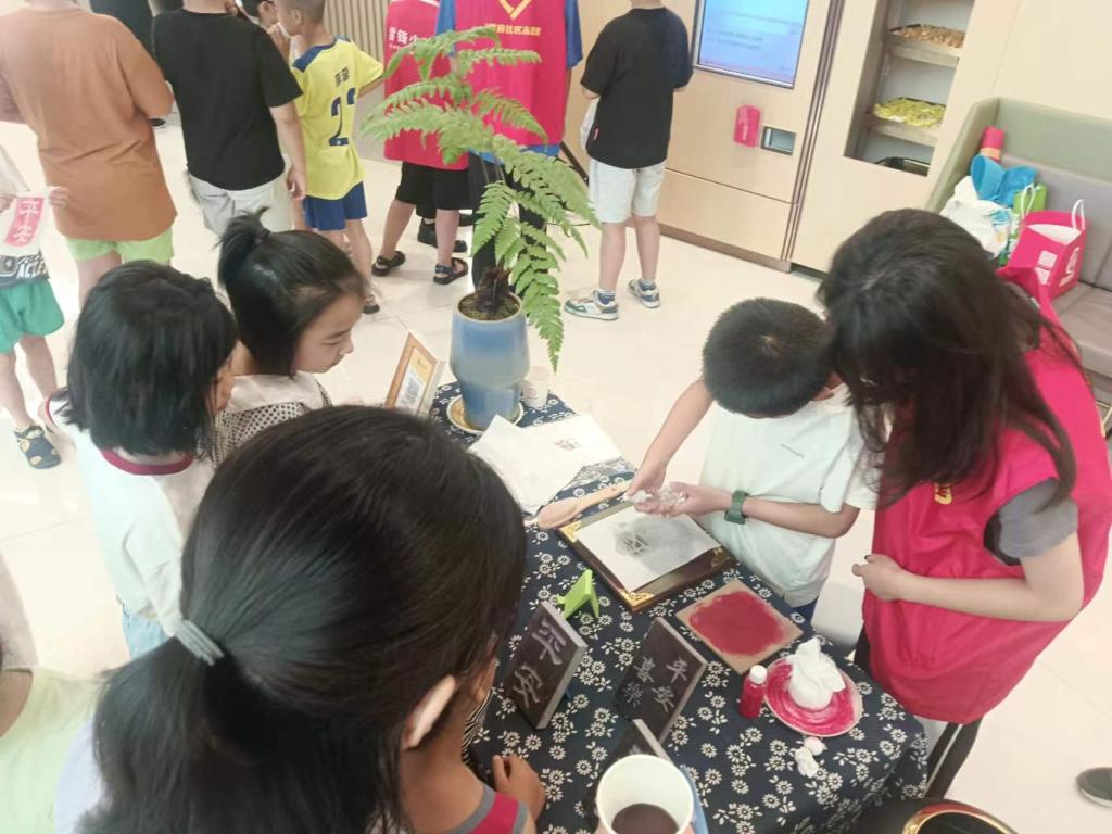 活动以游戏+字画拓印+暑期安全知识竞赛的形式开展,签到结束后,小朋友们在志愿者的引导下,按照5列小纵队的方式有序参与各个活动板块,现场秩序井然,确保所有到场小朋友都能体验到不同的游戏、参与字画拓印及安全知识答题,最终领取到小零食和小扇子。