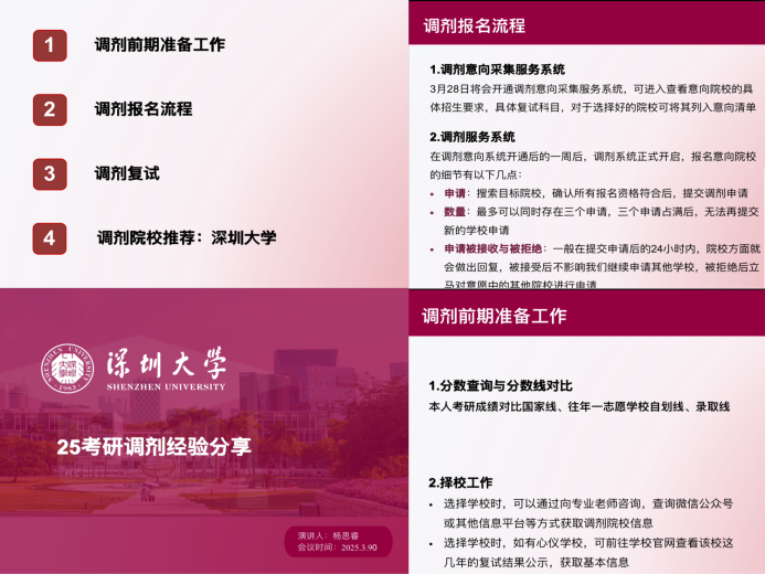 杨思睿校友结合自身调剂至深圳大学的经历,详细梳理调剂流程中的材料准备、沟通技巧与心态调整,并分享选择深大的区位优势与学科资源,为考生提供多元参考。