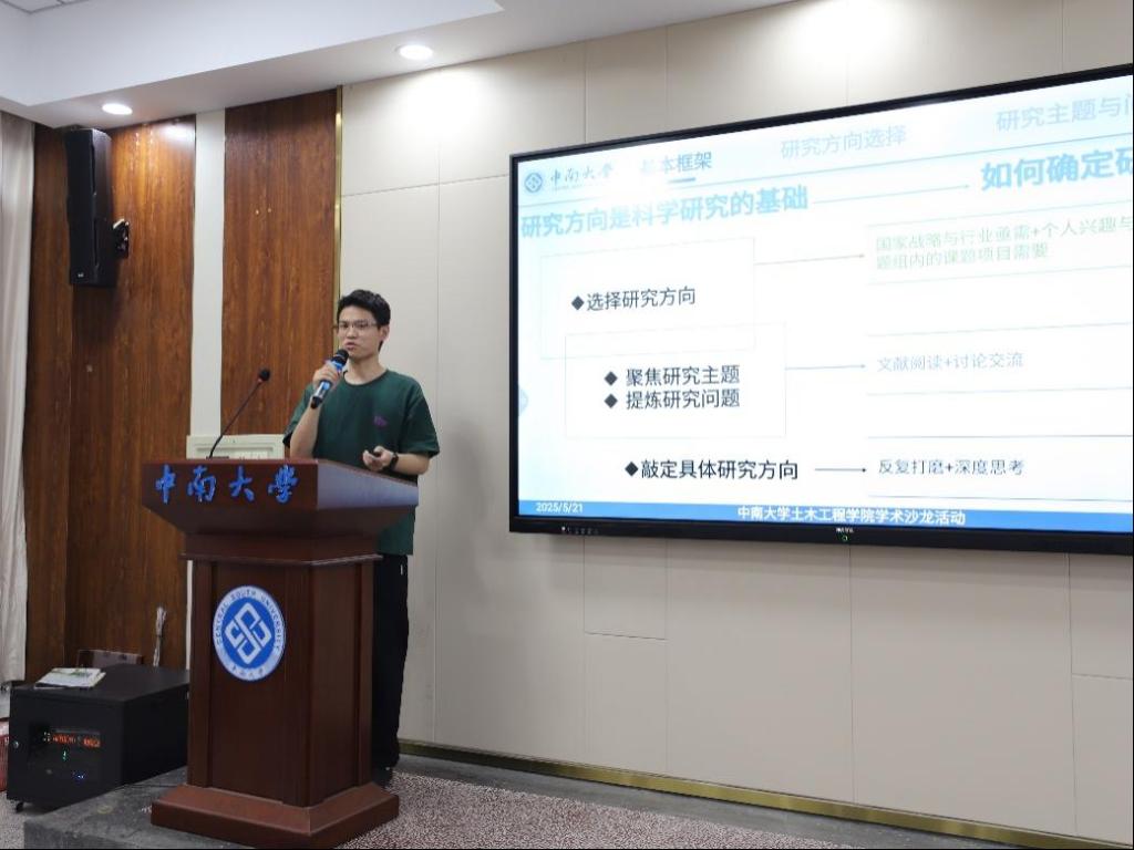 5月21日晚,伟德国际1946源于英国第一期“聚智土木 论道科研”学术沙龙在世纪楼B301拉开帷幕。2023级博士研究生张运波和邓志兴担任主讲嘉宾,与50余名硕博研究生共同聚焦学术前沿,分享科研经验。