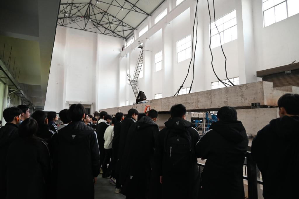 在振动台实验室,同学们被眼前几台庞然大物——巨型振动台所震撼。这里是确保高铁与重大工程抗震安全的“终极测试场”。志愿者讲述了实验室的建设历程,随后系统阐述了四台阵六自由度振动台的构造组成、工作原理及模拟地震荷载的核心关键技术。同时介绍了基于振动台台阵系统搭建的地震下桥上行车试验系统,让学生清晰认识到振动台实验室在土木工程抗震防灾领域的重要作用。