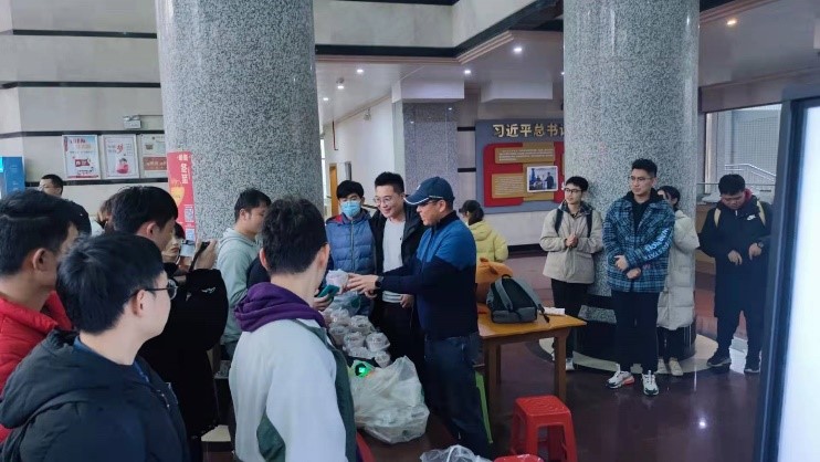 在南校区,领取饺子的地点在后勤楼,现场气氛火热。后勤保障部副部长丁建农一行人在南校区亲自参加了饺子的发放,并与工作人员亲切合影,为了让课业安排紧凑的同学也能感受到学院的关怀,本次活动一直持续到了晚上近十点。