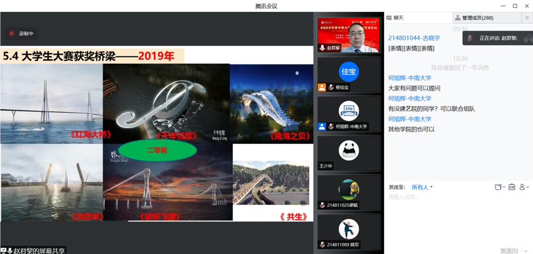 本次线上讲座,赵君黎教授以丰富的公路桥梁从业经验为基础,以“中交公规院杯世界大学生桥梁设计大赛”为依托,从历史回顾、基本要求、竞赛胜出、团队力量、案例介绍五个方面对大赛进行介绍。自2017年来,“中交公规院杯”已连续四年成功举办,是世界交通运输大会的重要组成部分,获得社会和高校的积极响应。