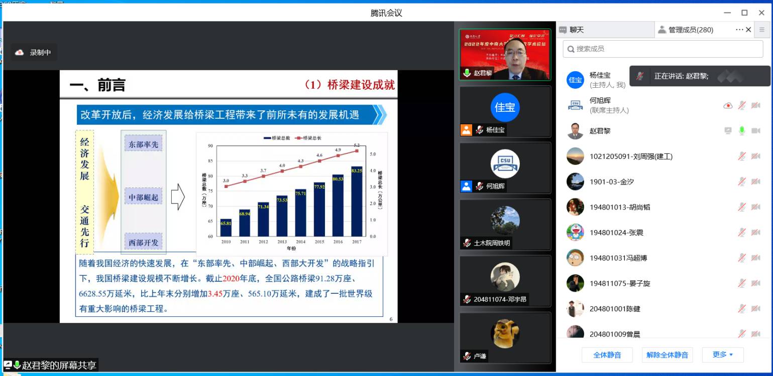 本次线上讲座,赵君黎教授以丰富的公路桥梁从业经验为基础,为我们讲解公路桥梁设计规范体系与安全耐久共性问题,从规范新体系、桥梁新形势、行业新要求等多方面进行介绍。桥梁工程是国家社会资产的重要组成部分,我们桥梁建设已取得世界瞩目的成就。