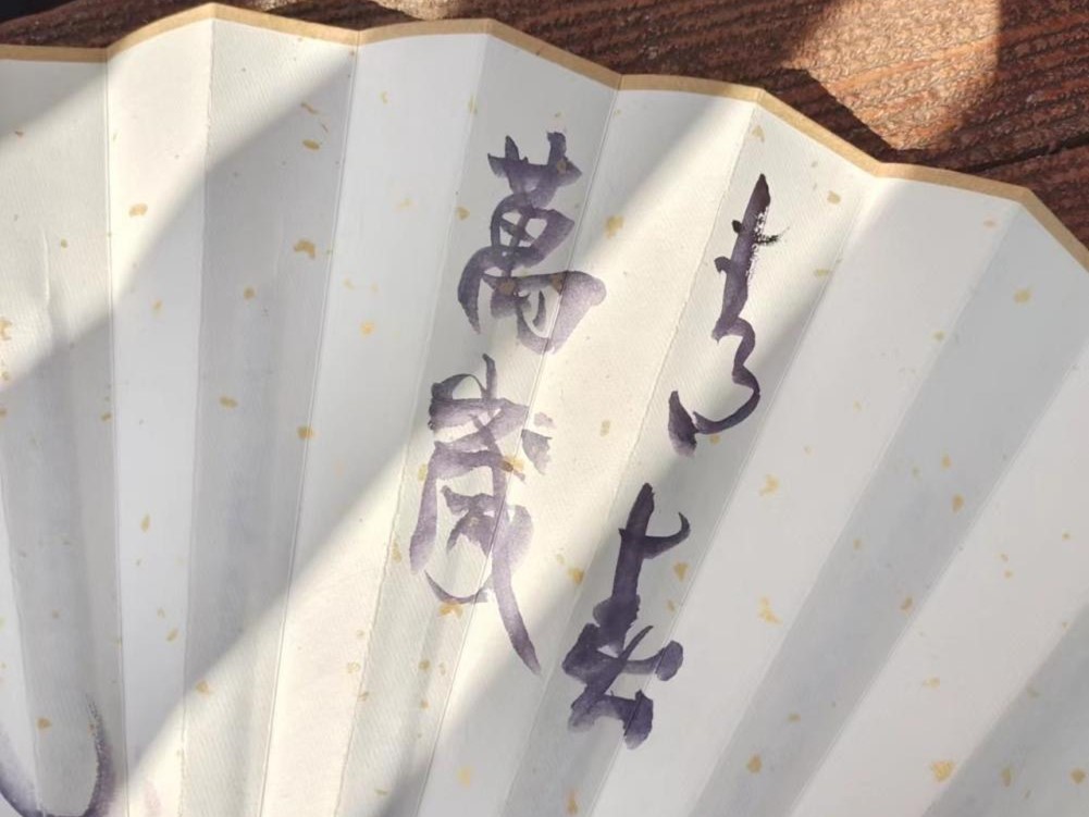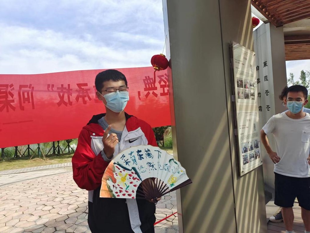 时值春夏交替之际,大自然充斥着春的生机和夏的热烈,绽放着绚丽的色彩;同学们在这里一起探寻那五月的风景,效仿古代文人吟诗作画,别有一番风味。各组同学在老师的引导下在问渠长廊中寻找花朵图片并选定一种,根据花名联想诗句,使用毛笔和颜料在纸扇上作画题诗,完成后集体展示。活动期间,学工部副部长姚勇亲临活动现场给予指导,并为同学们题扇,留下了“青春万岁”的题句。