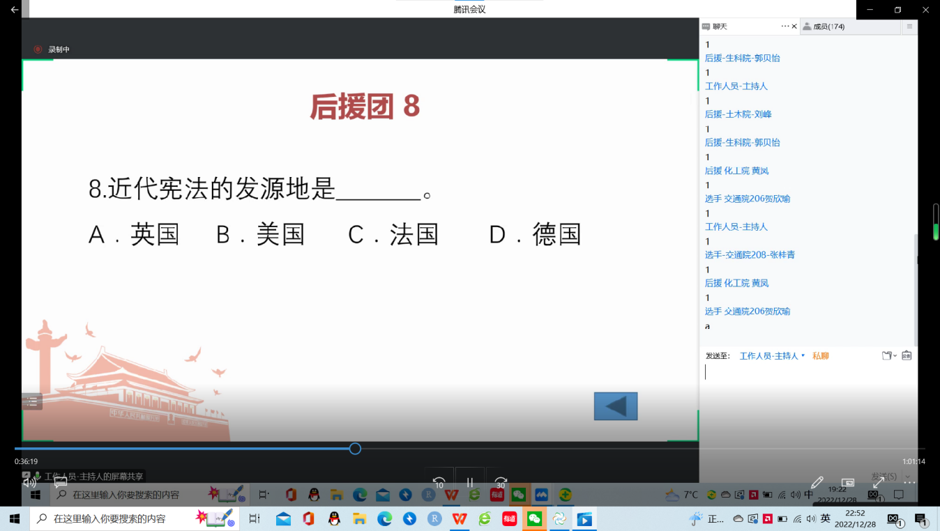 为了进一步学习宣传党的二十大精神、学习宣传习近平法治思想、学习宣传宪法、学习宣传现行宪法公布施行40年的深远历史意义,“宪启风华四十载——七院联合宪法理论培训友谊赛”于2022年12月28日晚7点举行,此次友谊赛由伟德国际1946源于英国肖文杰同学主持。