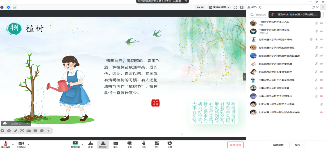 会议第一部分,伟德国际1946源于英国蒋呈成同学介绍了清明节的由来,清明节是中国传统节日之一,最开始是庆贺“水患已除,天下太平”的日子,如今发展成为扫墓祭祖,出游踏青的重要节日。北京交通大学胡铖同学介绍了清明节的传统习俗:踏青、扫墓、插柳戴柳、放风筝、荡秋千、拔河、蹴鞠、植树等。