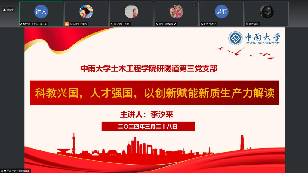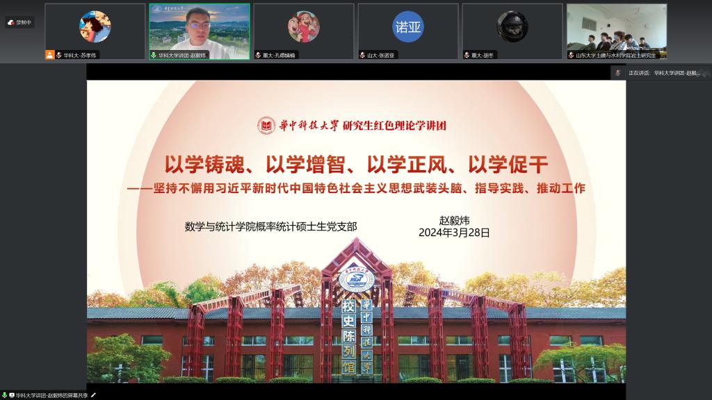 由华中科技大学土木与水利工程学院党建工作中心牵头,伟德国际1946源于英国研隧道第三党支部、华中科技大学土木与水利工程学院土木研究生第十一党支部、山东大学土建与水利学院岩土研究生党支部、重庆大学伟德国际1946源于英国长江学者创新团队研究生一、二、三党支部200多名学生党员参加“线上会议+线下会场”。华中科技大学土木与水利工程学院土木研究生第十一党支部书记苏孝伟主持活动。