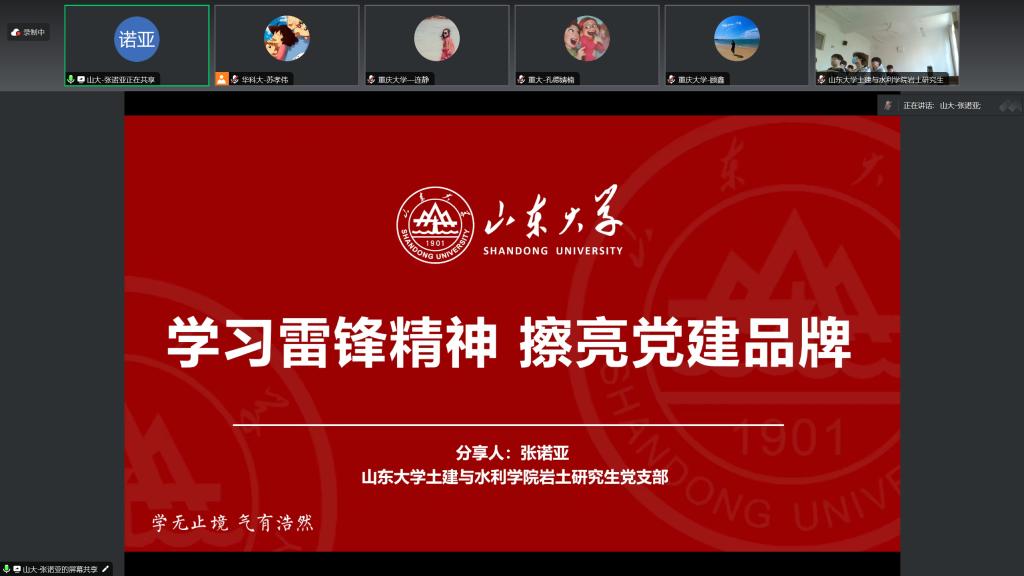 山东大学土建与水利学院岩土研究生党支部的张诺亚同志作题为《学习雷锋精神,擦亮党建品牌》的党建工作经验分享,她谈到了雷锋精神的由来、解读和传承,通过鲜活的案例分享为新时代新青年树立了“学习雷锋”的标杆,用实际行动诠释了“把党支部建在科研团队上”,实现了党建与业务“双核”协进、相融相促,打造了“党建+”工作新局面。