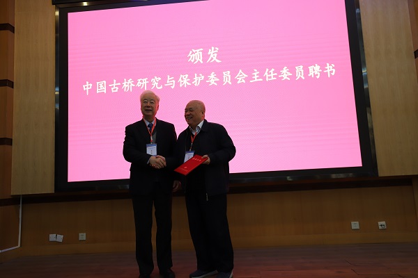 今年是北京茅以升科技教育基金会中国古桥研究与保护委员会成立10周年,也正值古桥委员会换届之年,基金会主任委员孙永福向新任主任委员郑皆连颁发聘书。郑皆连在开幕辞中指出,中国古桥作为千年中华文明发展体系中的一个重要分支,其建设经验、理念、工艺技艺,对我国古桥及历史文化研究、现代桥梁工程具有极大参考价值,是中华文化的历史瑰宝。但是伴随着社会的发展变迁,这些古桥正在以惊人的速度在大量消亡,古桥保护工作刻不容缓。