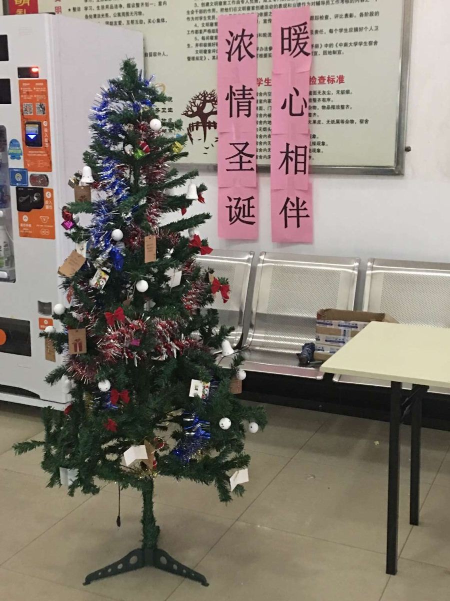 上午9:00,心协工作人员在升华公寓12、13、25栋楼下布置好了摊位,五彩的圣诞树,缤纷的糖果,精致的礼盒,都为这个飘着小雨的冬日增添了一份温暖。