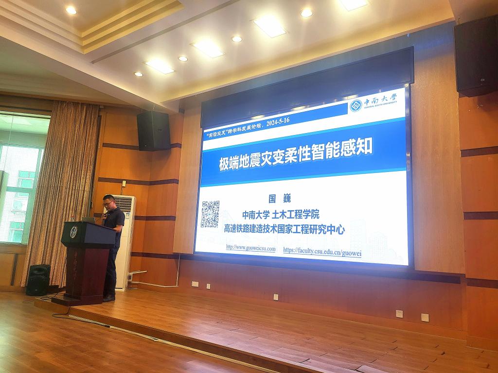 在第二场报告中,国巍教授首先分享了个人对科研工作的体会。他认为,面对新的形势,土木工程学科需要瞄准国家重大需求,找出关键瓶颈问题和颠覆性难题,通过学科交叉赋能解决真问题。随后,国巍教授将其跨学科研究工作高度概括为“控制+感知+智能”,详细阐述了内涵,然后重点介绍了在极端地震灾变柔性智能感知方面的研究工作,以生动的实例向大家展示了土木工程与智能感知、数字孪生、人工智能等新兴技术的交叉融合。