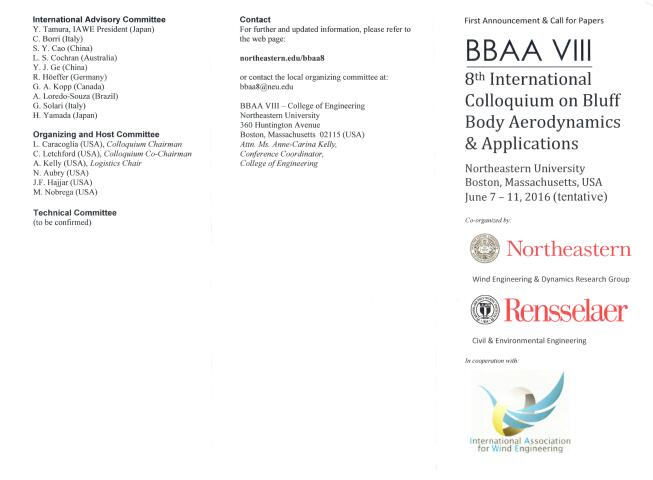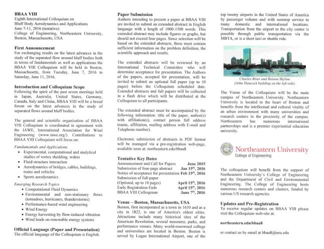 第八届国际钝体空气动力学及其应用大会详细信息及关键时间节点如下: