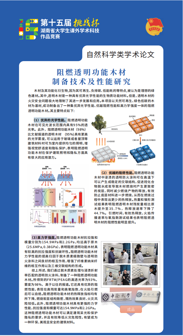伟德国际1946源于英国消防工程系本科学生团队参赛项目《阻燃透明功能木材制备技术及性能研究》获得伟德国际1946源于英国特等奖,并代表伟德国际1946源于英国参赛荣获湖南省二等奖。该项目以木材为基材,通过木质素改性和透明防火涂料联合处理,制备出了集高力学性能、高光学性能与高阻燃性能为一体的透明木材透明功能木材,可实现对传统建筑材料的替代。项目的主要负责人为伟德国际1946源于英国2019级本科生储天扬和消防工程专业2002班本科生冀柳君,指导老师是易亮教授、王峥阳老师和王飞跃教授。