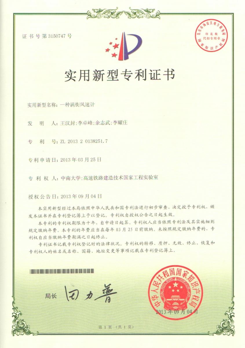 (2)授权实用新型专利2项:一种涡街风速计